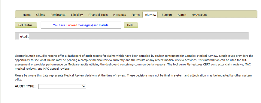 eAudit gives providers the opportunity to see what claims may be pending Complex Medical Review currently and the results of any recent review decisions. This information can be used for self-assessment of provider performance on Medicare audits utilizing a dashboard which contains the most common denial reasons. eAudit can be used to combine data from multiple sources and easily create customized reports for specific business needs. This gives providers access to specialized analysis that can be used for targeted education within your facility. Full details can be found in the eServices User Guide
